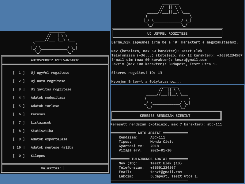 Az alkalmazás komplett adminisztrációs megoldást nyújt autószervizeknek, kiváltva a nehézkes papíralapú nyilvántartást. Egyetlen átlátható felületen kezeli az ügyfelek, járművek és szervizelések adatait. A szoftver teljes körű adatkezelést tesz lehetővé, miközben intelligensen ellenőrzi a bevitelt és javítja a formázási hibákat, így minimalizálva a tévedést. Segíti a napi munkát a lejáró műszaki vizsgák figyelésével és pénzügyi statisztikák generálásával. Az adatok biztonságáról a mentés funkció gondoskodik, az információk pedig Excel-kompatibilis formátumban is kimenthetők.